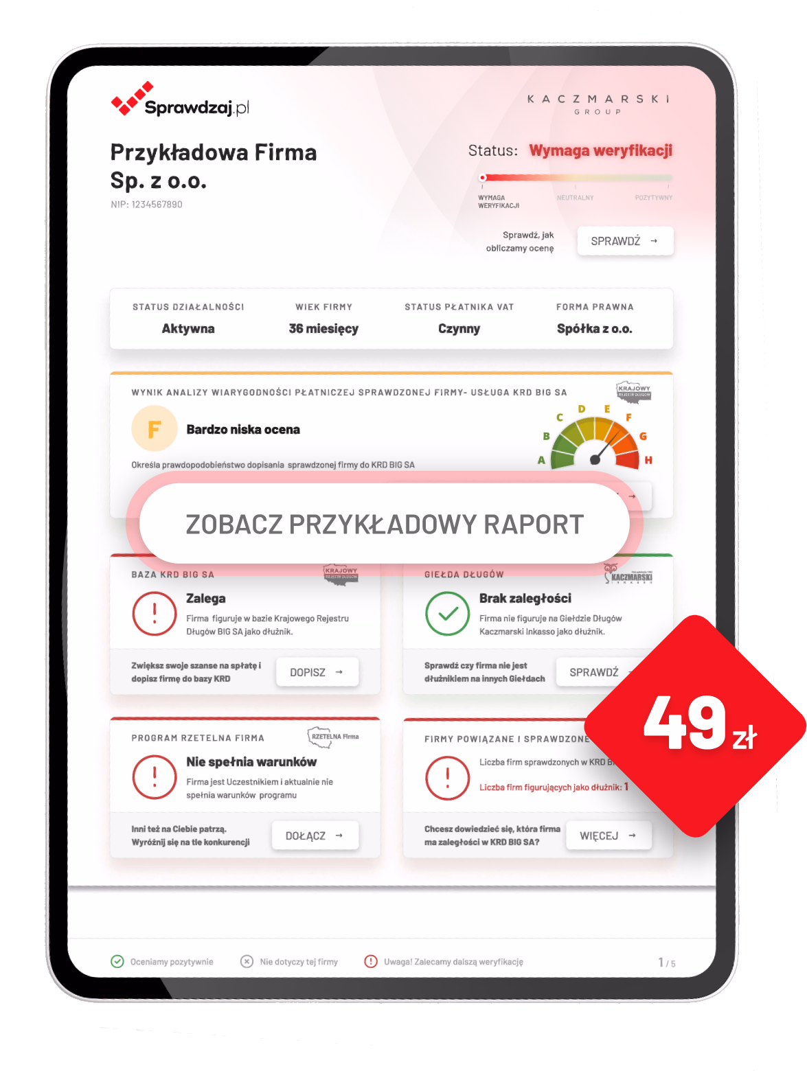 Film zawiera treść: Sprawdzaj.pl to usługa dla konsumentów oraz przedsiębiorców, świadczona przez Kaczmarski Group sp. j. z siedzibą we Wrocławiu (dalej KG). W ramach usługi Sprawdzaj.pl korzystający z nich konsument oraz przedsiębiorca otrzymuje raport na temat wybranego przez niego podmiotu niebędącego konsumentem), który stanowi przygotowane przez KG zestawienie podstawowych (minimalnych) danych przydatnych do dokonania oceny finansowej tego podmiotu, opracowane w oparciu o źródła danych: KRS/CEIDG/REGON; Krajowy Rejestr Długów Biuro Informacji Gospodarczej S.A.: Giełda Wierzytelności prowadzona przez Kaczmarski Incasso sp. j., Program Rzetelna Firma prowadzony przez KG, lista ostrzeżeń publicznych Komisji Nadzoru Finansowego, inne bazy danych, serwisy internetowe etc. (adekwatne, wybrane przez KG przy dochowaniu należytej staranności). Przygotowany przez KG raport nie stanowi opinii, czy też rekomendacji KG w przedmiocie współpracy ze wskazanym w zleceniu podmiotem gospodarczym. Szczegóły na stronie internetowej Sprawdzaj.pl.